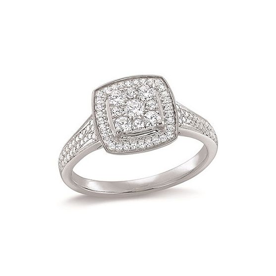 Son design carré rehaussé d'un halo scintillant sublime les pierres centrales et offre un éclat exceptionnel.