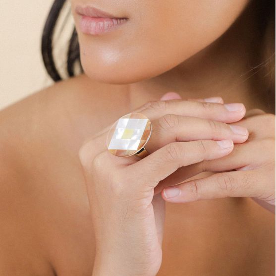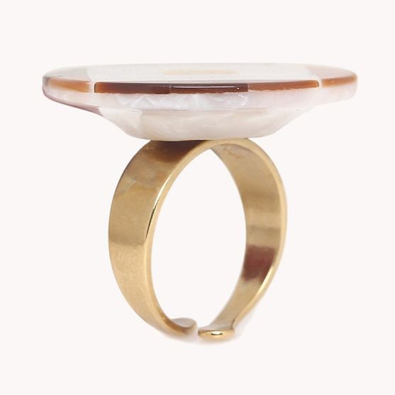 Cette bague en laiton doré ajustable Nature Bijoux 19--25852 collection San Lazzaro, met à l'honneur la savoir-faire artisanal de la marqueterie à travers une composition raffinée de nacres naturelles.