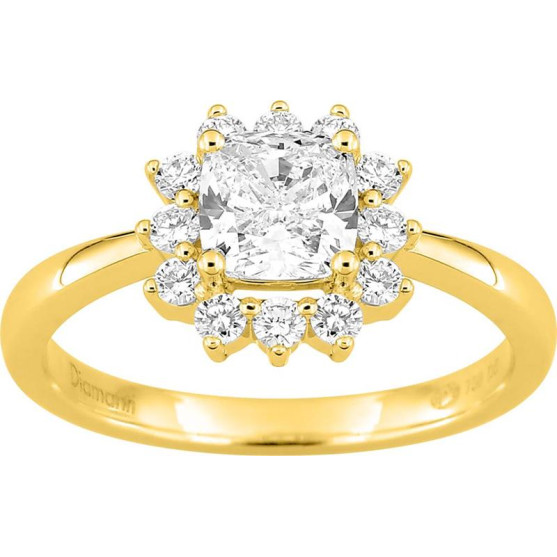 Bague en or 750 millièmes Diamanti référence DS1072.20, mise en lumière par un diamant synthétique central taille coussin de 1 carat, éclatant et raffiné. Autour de cette pierre principale, un délicat halo de diamants synthétiques ronds vient magnifier la brillance de l'ensemble, pour un poids total de 1.31 carat de qualité F-VS.