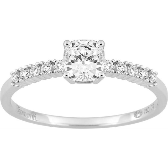 Solitaire accompagné en or 750 millièmes Diamanti référence DS1074.21, mis en lumière par un diamant synthétique central taille coussin de 0.50 carat, éclatant et raffiné. Le corps de bague également serti de diamants synthétiques vient magnifier la brillance de l'ensemble, pour un poids total de 0.63 carat de qualité F-VS.