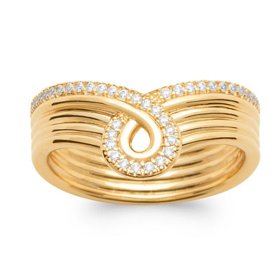 Cette bague en plaqué or séduit par son design tout en mouvement. Sa structure formée de fines lignes dorées s'entrelace avec élégance, créant une boucle centrale délicatement soulignée par un chemin d'oxydes scintillants qui en épouse parfaitement la courbe.