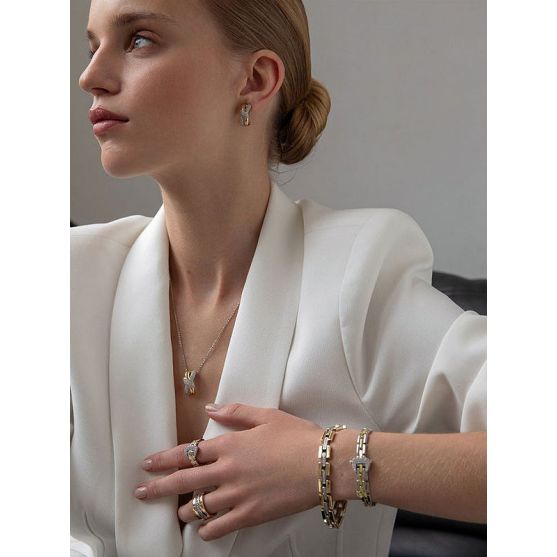 Elle associe l'éclat du métal argenté à une touche de ton doré qui court au centre de l'anneau, créant un contraste moderne et élégant. La tête de bague présente une forme graphique originale, soulignée par un pavage d'oxydes de zirconium scintillants qui apportent une belle intensité lumineuse.