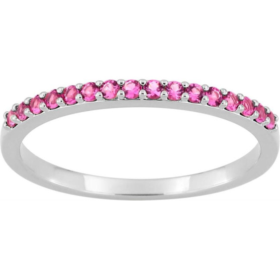 Cette bague en argent 925 millièmes présente un design fin et délicat, idéal pour un porté élégant au quotidien. Son anneau met en valeur une ligne d'oxydes de zirconium rouges-roses sertis sur le dessus, disposés en demi-tour.