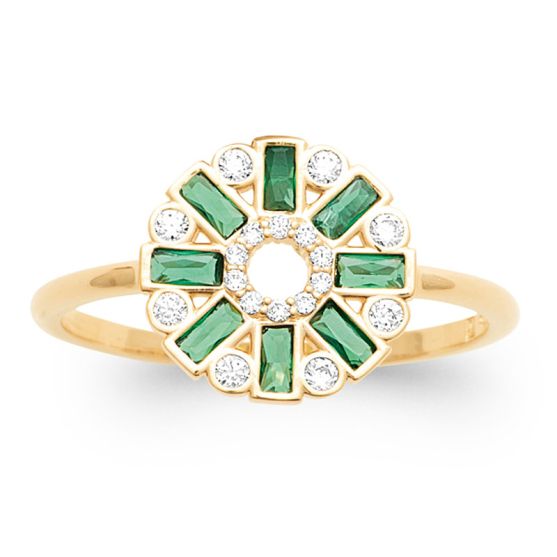 Le dessus de la bague est élégamment serti d'un jeu de pierres aux formes contrastées : des oxydes verts taillés en rectangles, disposés avec précision, offrent une profondeur intense et sophistiquée, tandis que des oxydes blancs ronds viennent ponctuer l'ensemble de leur éclat. Cette alternance de tailles et de couleurs crée un rythme visuel harmonieux entre modernité et raffinement.