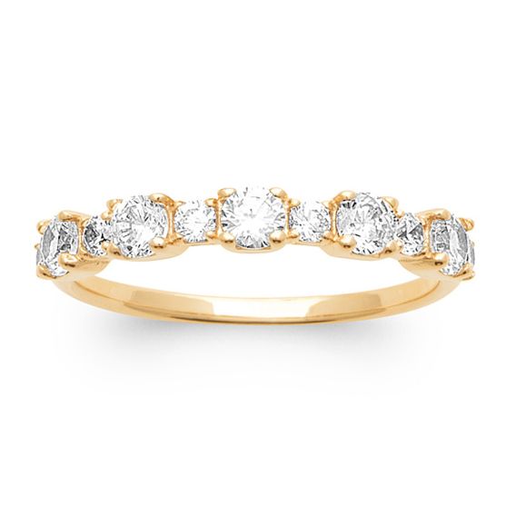 L'équilibre entre la régularité du motif et la variation des pierres confère à cette demi-alliance un style à la fois classique et légèrement moderne, parfait pour sublimer la main avec discrétion et éclat.