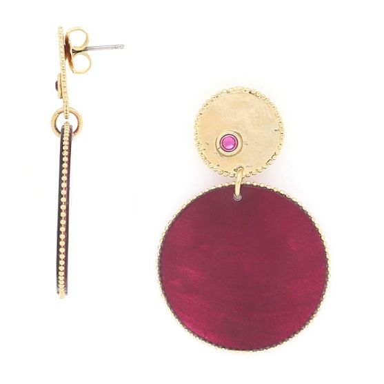 Ces boucles d'oreilles en laiton doré de la collection Marly présente des éléments circulaires dont un est orné de nacre capiz bordeaux effet velours et un autre de strass de Swarovski.