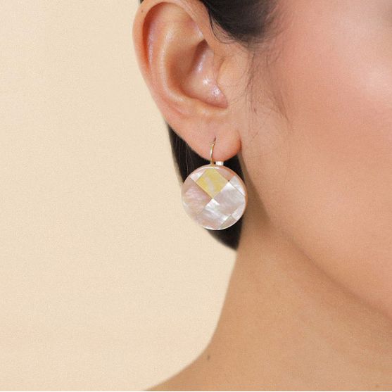 Montées sur laiton doré, elles se distinguent par leurs motifs géométriques mêlant subtilement les reflets irisés de la nacre noire de Palawan, de la nacre blanche, de la nacre brune et de la nacre dorée.