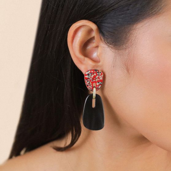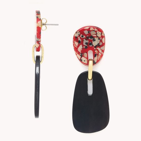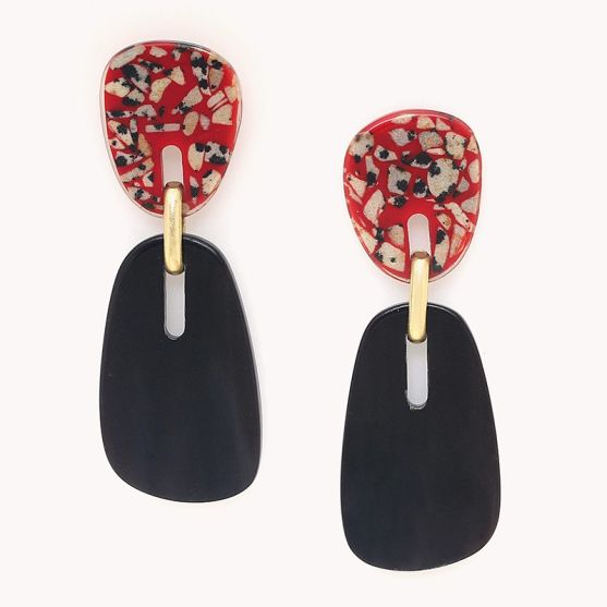 Ces boucles d'oreilles pendantes Nature Bijoux 12--90360 de la collection Sicilia en laiton doré présentent deux matières originales, la corne noire lisse et intense ainsi qu'un jaspe dalmatien rouge aux nuances mouchetés uniques.