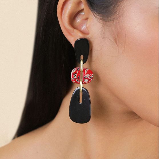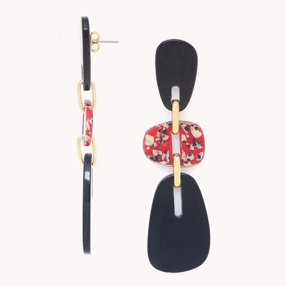 Ces boucles d'oreilles pendantes Nature Bijoux 12--90363 de la collection Sicilia en laiton doré présentent deux matières originales, la corne noire lisse et intense ainsi qu'un jaspe dalmatien rouge aux nuances mouchetés uniques.