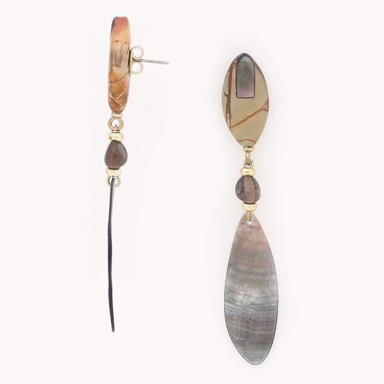 Confectionnées en laiton doré, elles se distinguent par les matières naturelles comme le jaspe Picasso, le quartz fumé et la nacre noire de Palawan mises en valeur par l'éclat chaleureux du métal doré.