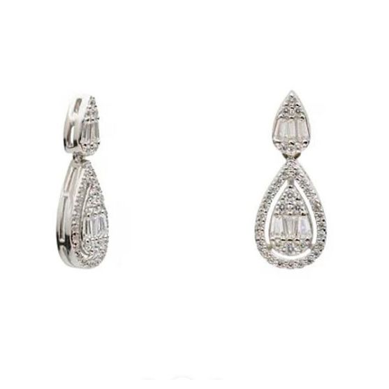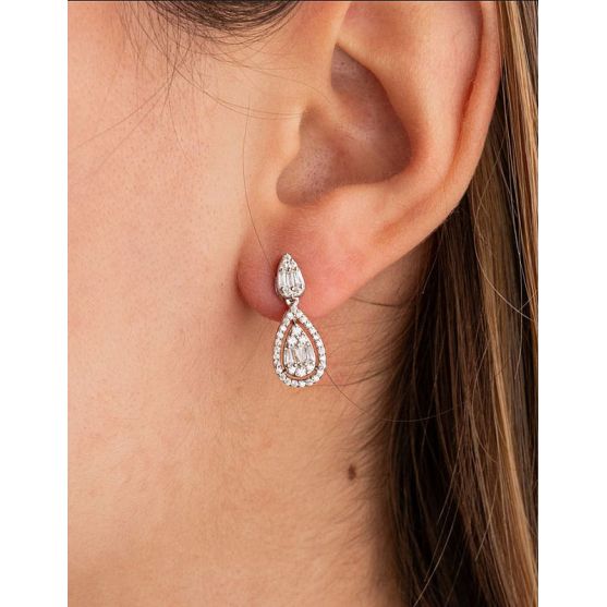 Elles présentent une forme goutte très féminine : une première goutte sertie d'oxydes blancs vient se poser au niveau du lobe, tandis qu'une goutte pendante plus grande, également entourée d'un pavage scintillant, apporte mouvement et luminosité.