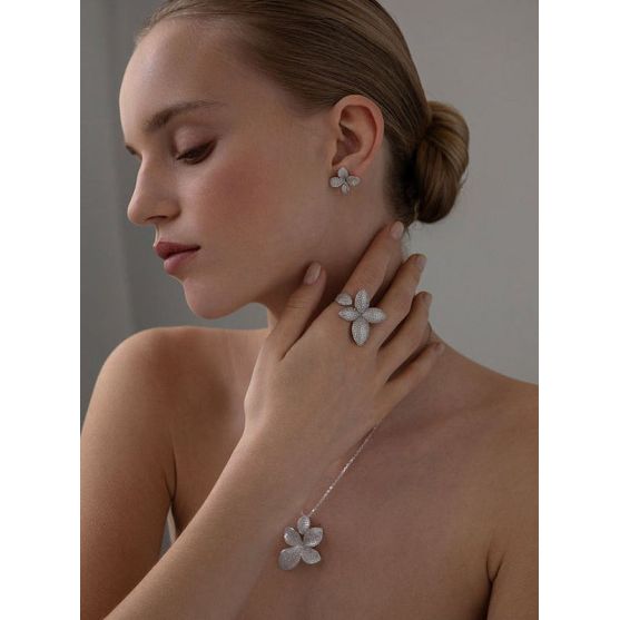 Elles sont ornées de fleurs dont les pétales sont entièrement sertis d'oxydes de zirconium qui captent magnifiquement la lumière.
