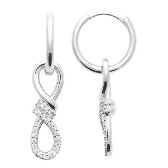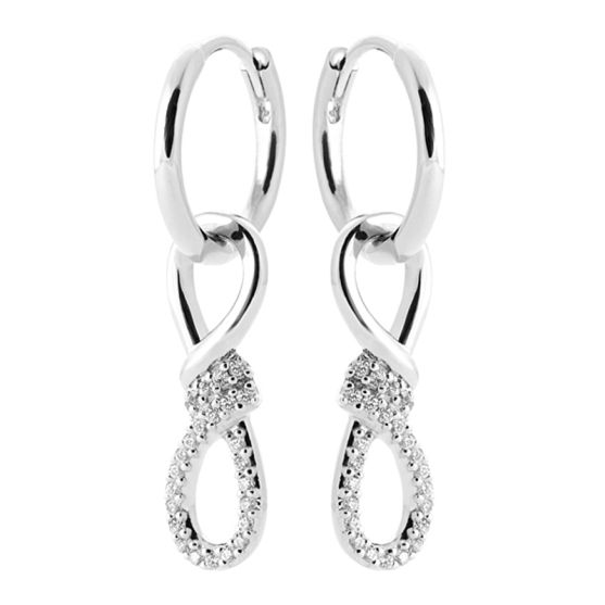 Composées d'une créole lisse en argent poli, elles se prolongent par un jeu de lignes entrelacées qui apporte du mouvement et de la finesse. La partie inférieure est sublimée par un motif ovale sertie de multiples oxydes de zirconium scintillants, offrant un bel éclat à chaque mouvement.