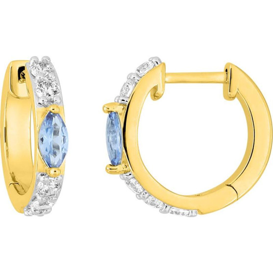 Ces boucles d'oreilles créoles sont serties d'un oxyde de zirconium taille navette, d'un délicat bleu ciel. Cette pierre centrale est sublimée par un entourage d'oxydes blancs, formant un halo éclatant qui accentue son éclat.