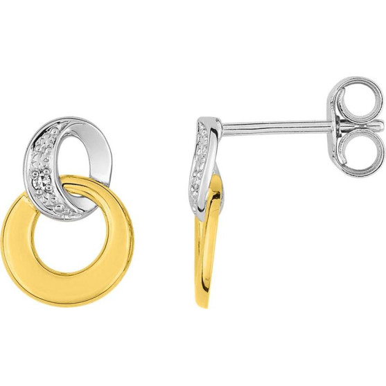 Ces boucles d'oreilles en or 750 millièmes jouent avec élégance sur le contraste du bicolore et la lumière des diamants. La partie haute se compose d'un cercle en or blanc serti de diamants formant un halo lumineux qui capte le regard dès le premier instant; Les pierres diffusent un éclat subtil et raffiné.