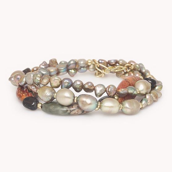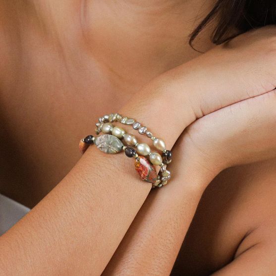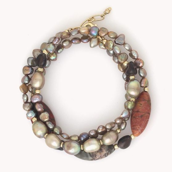 Confectionné en laiton doré, il se distingue par les matières naturelles comme le jaspe Picasso, les perles de culture, le quartz fumé et la nacre noire de Palawan mises en valeur par l'éclat chaleureux du métal doré.