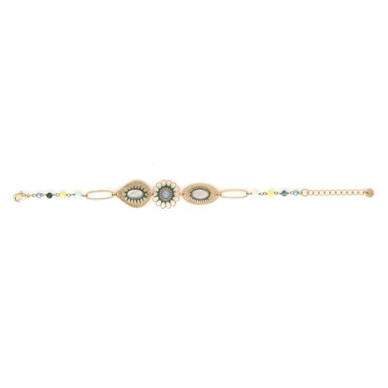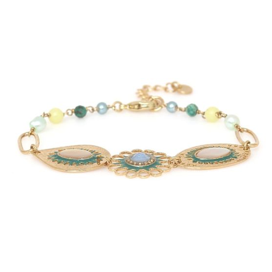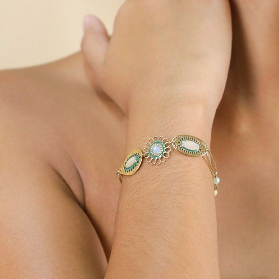 Ce bracelet raffiné en laiton doré de la collection Zelie signée Franck Herval séduit par son esprit bohème et délicat. Au centre, un motif ovale finement travaillé, entouré de turquoise tibétaine, abalone rose, unakite naturelle et jade s'associent aux perles de culture, Swarovski et émail coloré, capte la lumière avec élégance.