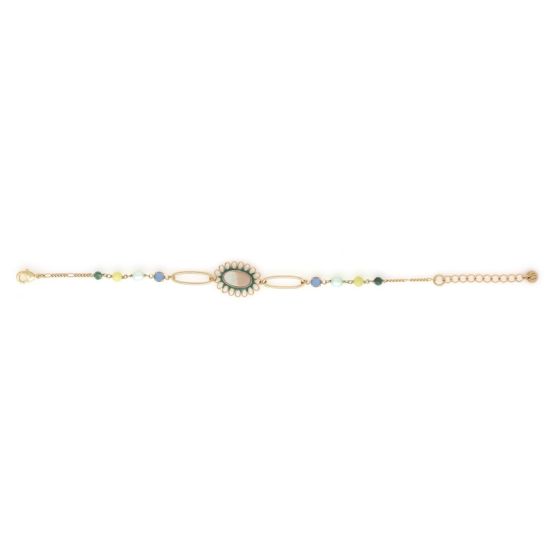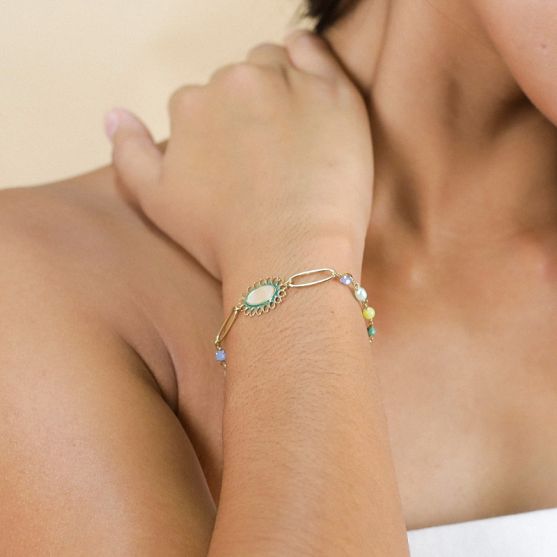 Ce bracelet raffiné en laiton doré de la collection Zelie signée Franck Herval séduit par son esprit bohème et délicat. Au centre, un motif ovale finement travaillé, entouré de turquoise tibétaine, abalone rose, unakite naturelle et jade s'associent aux perles de culture, Swarovski et émail coloré, capte la lumière avec élégance.