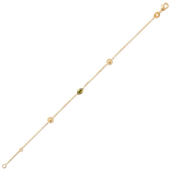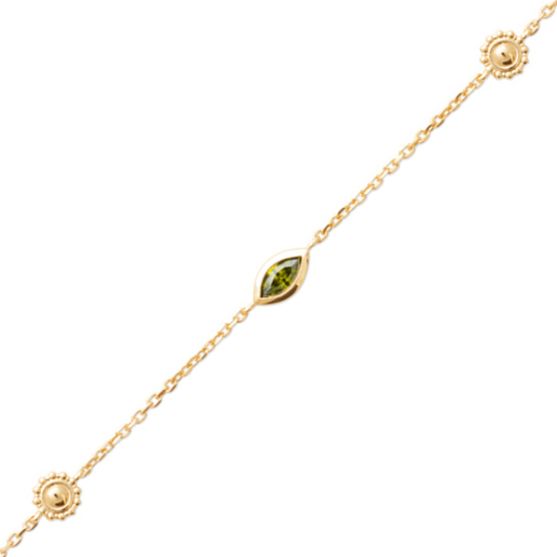 Ce collier plaqué or présente deux petites pastilles ainsi qu'un oxyde de zirconium vert sur une chaine maille forçat ajustable à 16 et 18 cm.
