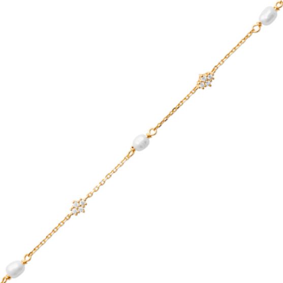 Ce bracelet plaqué or allie avec élégance la douceur des perles de culture à l'éclat subtil des oxydes de zirconium scintillants. Sa chaine fine est ponctuée de motifs sertis d'oxydes, apportant une touche lumineuse, tandis que les perles de culture ajoutent raffinement et féminité.