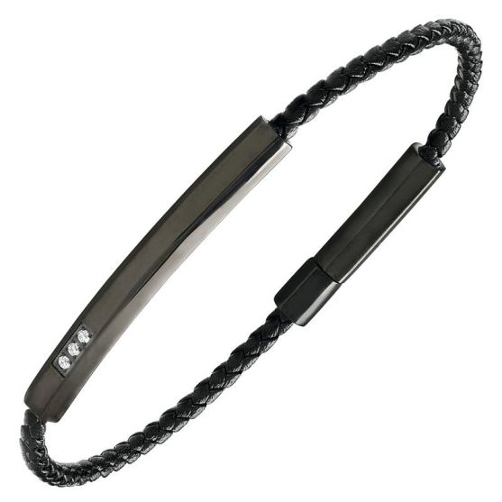 Ce bracelet Jourdan cuir noir tressé, agrémenté d'une plaque acier noir est serti de trois diamants.