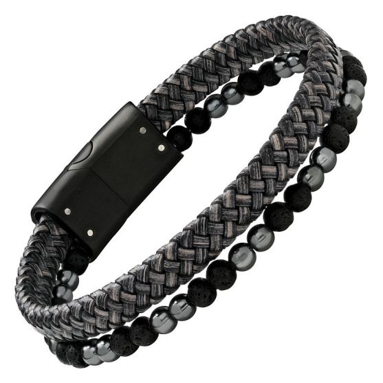 Ce bracelet de la marque Jourdan JH340005B est composé de plusieurs brins, en cuir agrémenté d'un fermoir acier noir, mais également de perles d'hématites et pierre de lave.