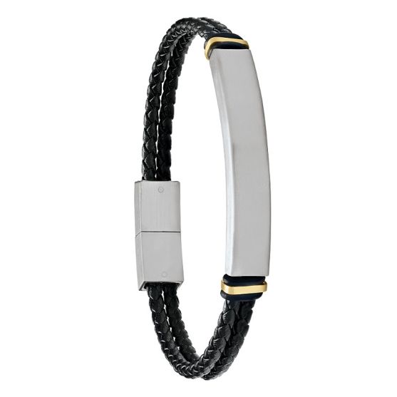 Ce bracelet de la marque Jourdan est composé de plusieurs brins en cuir noir tressé avec un fermoir en acier et acier doré.