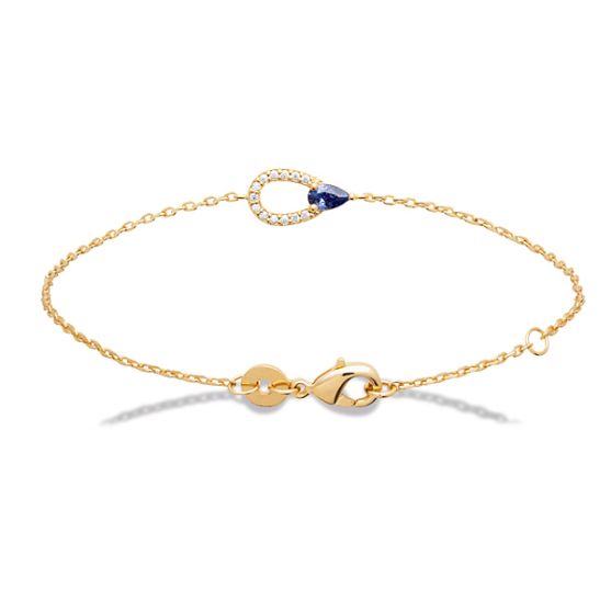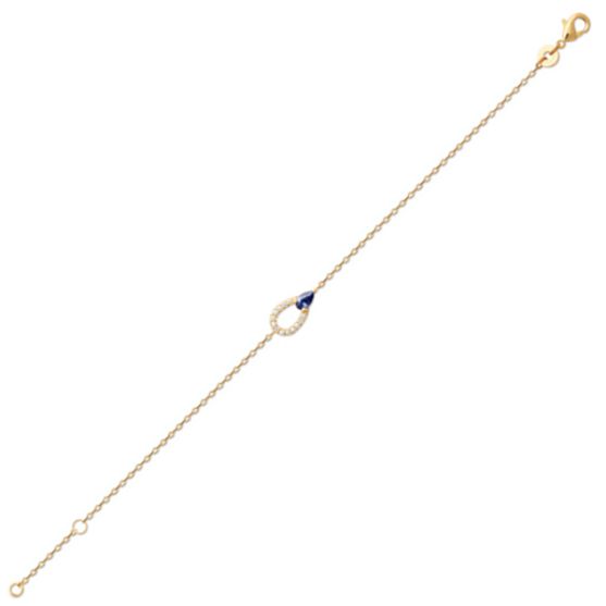 Un bracelet raffiné en plaqué or sublimé par un motif élégant. Celui-ci associe une pierre goutte bleu profond, mise en valeur par un entourage d'oxydes de zirconium blancs scintillants, formant une boucle lumineuse et féminine.