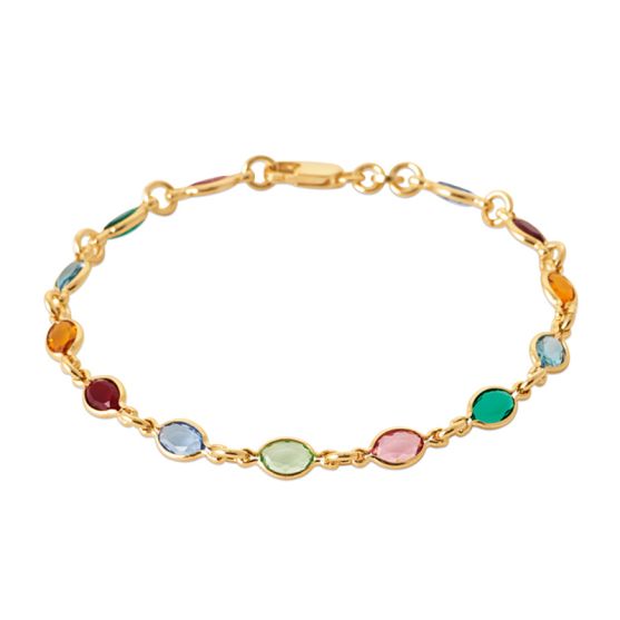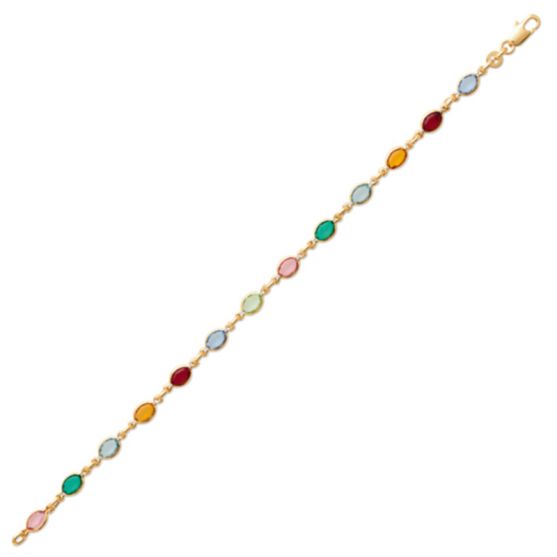 Ce bracelet en plaqué or séduit par son allure lumineuse, ponctuée d'éléments ovales sertis d'oxydes multicolores. Chaque pierre, aux teintes variées, bleu, vert, jaune ou encore rouge, apporte une touche de fraicheur et de gaieté, créant un élégant jeu de couleurs tout au long du poignet.