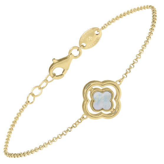 Ce bracelet Charles Garnier en argent doré séduit par son motif en forme de trèfle, à la fois délicat et raffiné. Réversible, il offre deux styles en un seul bijou : une face lumineuse ornée de nacre aux reflets doux et naturels, et une autre plus scintillante, pavée d'oxydes de zirconium pour un éclat élégant.