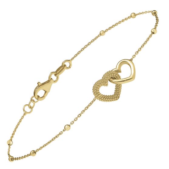 Bracelet Jourdan en argent doré au design délicat et romantique, il se compose d'une chaine ponctuée de petites billes dorées qui apportent rythme et légèreté. En son centre, deux cœurs entrelacés créent un jeu de volume subtil : l'un, lisse et épuré, s'entrelace harmonieusement avec l'autre, au contour texturé et scintillant.