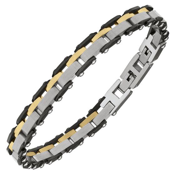 Bracelet homme Jourdan en acier aux nuances gris, noir et doré, composé de maillons larges et cossus qui lui confèrent une allure affirmée et contemporaine. Son design robuste, subtilement contrasté, en fait une pièce élégante et masculine, idéale pour un style moderne et assuré.