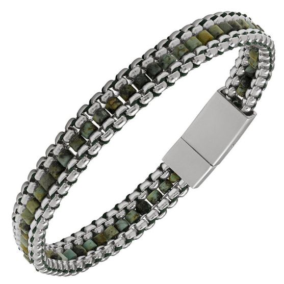 Ce bracelet acier est orné de pierres semi-précieuses de couleurs vertes.