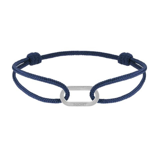 Ce bracelet Rochet au style contemporain associe avec caractère un cordon en coton bleu à un élément central en acier finition brossée. Son design épuré met en valeur un motif ovale légèrement allongé, traversé par le cordon pour un rendu moderne et graphique.