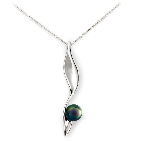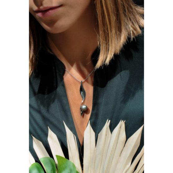 Son pendentif au mouvement fluide enveloppe avec grâce une perle de Tahiti de 10/11 mm de diamètre, dont les reflets profonds et changeants apportent une touche d'exotisme et de mystère.