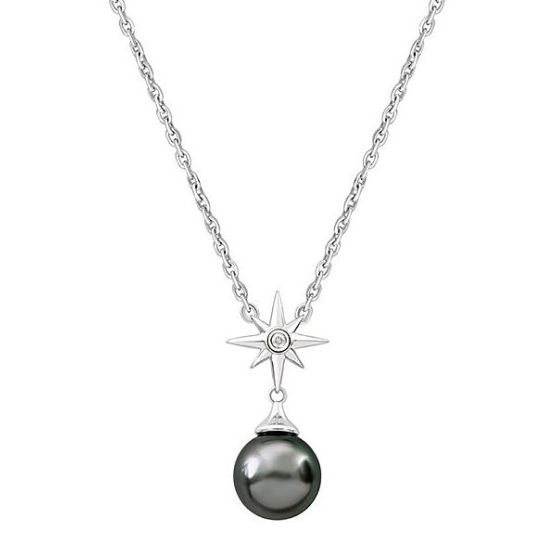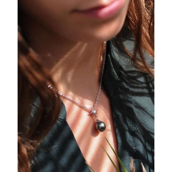 Son pendentif se compose d'une délicate étoile sertie d'un diamant, d'où descend avec grâce une perle de Tahiti (diamètre 10/11 mm) au lustre profond et envoutant.
