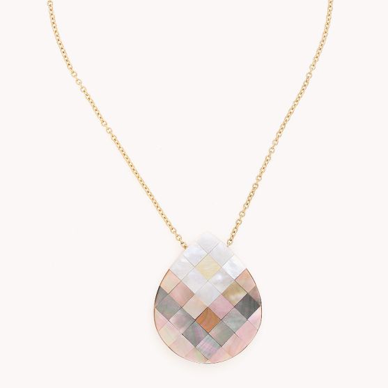 Un pendentif au motifs géométriques mêlant subtilement les reflets irisés de la nacre noire de Palawan, de la nacre blanche, de la nacre brune et de la nacre dorée, monté sur une chaine en laiton doré maille forçat ajustable de 45 à 49 cm.