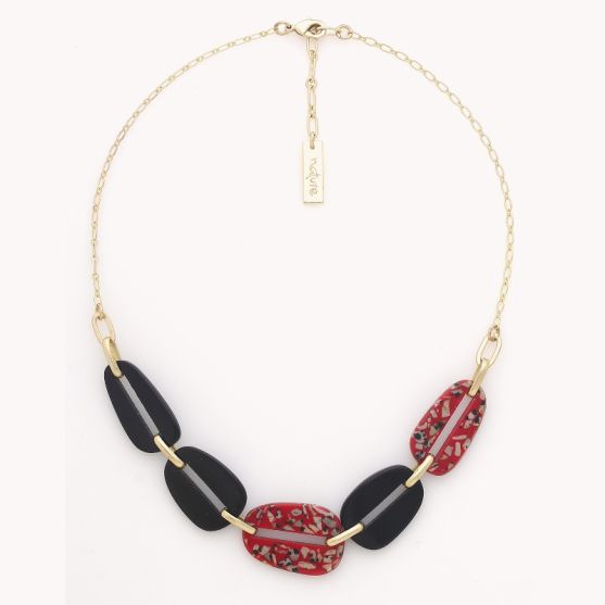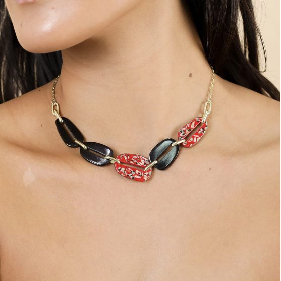 Sa chaine en laiton doré met en valeur d'élégants motifs mêlant corne noire lisse et intense à un jaspe dalmatien rouge aux nuances mouchetés uniques.
