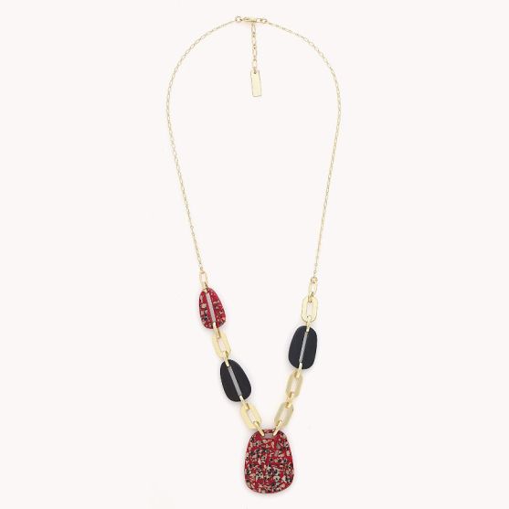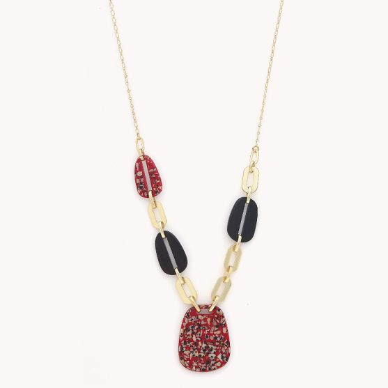 Sa chaine en laiton doré met en valeur d'élégants motifs mêlant corne noire lisse et intense à un jaspe dalmatien rouge aux nuances mouchetés uniques.
