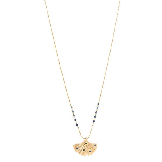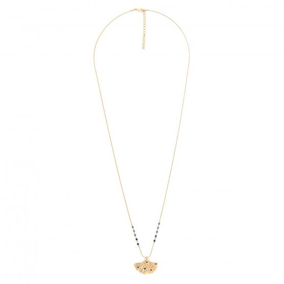 Ce collier Franck Herval présente une feuille de ginkgo orné de strass de Swarovski bleus sur une chaine maille fantaisie ajustable de 72 à 75 cm.
