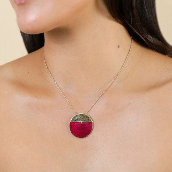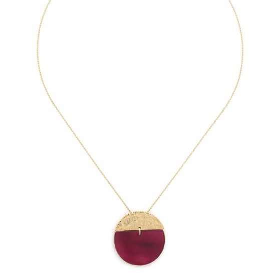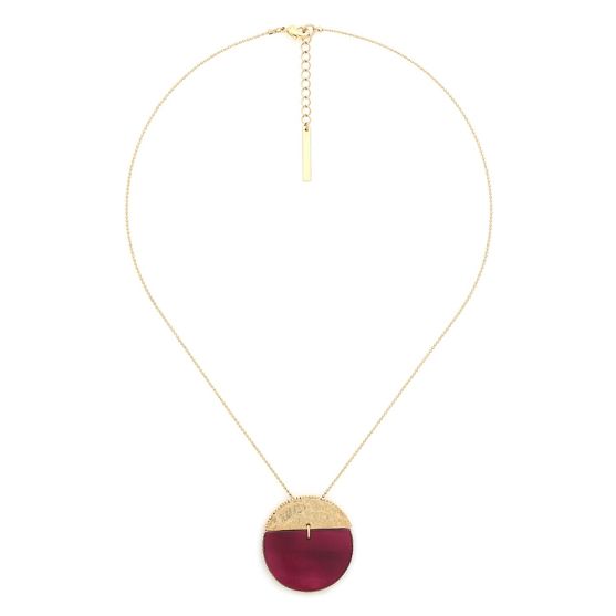 Ce collier raffiné en laiton doré de la collection Marly présente un élément circulaire orné de nacre capiz bordeaux effet velours sur une chaine maille fantaisie.