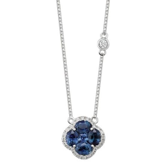 Ce modèle raffiné met à l'honneur un pendentif floral composé de quatre saphirs de 3X4 mm et d'un saphir taille princesse de 2.5 mm en leur centre, formant un coeur lumineux aux reflets bleus profonds. L'ensemble est sublimé par un pavage de 24 diamants qui entourent les pierres précieuses d'un éclat subtil, apportant brillance et élégance à cette création, sur une chaine maille forçat également ornée d'un diamant serti clos.