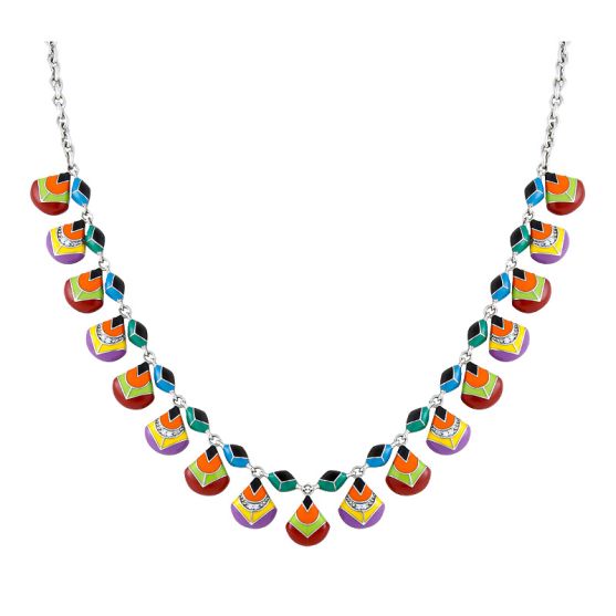 Un décor travaillé en laque multicolore aux teintes vibrantes, soulignées par des motifs géométriques contrastés de noir. Des oxydes de zirconium viennent ponctuer le dessin, apportant éclat et raffinement à l'ensemble.
