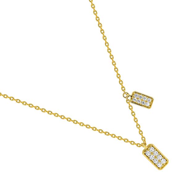 Ce collier Murat Paris en argent 925 millièmes doré séduit par son allure contemporaine et raffinée. Sa chaine maille forçat est sublimé par deux motifs rectangulaires serti d'oxydes de zirconium. Le pendentif principale, délicatement pavé, capte le lumière avec éclat, tandis qu'un second motif, plus petit, est positionné plus haut sur la chaine, apportant une touche d'originalité et un jeu de volumes modernes.