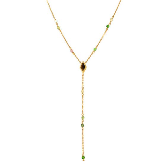 Ce collier Orus en argent doré présente un design fin et élégant, avec une chaîne ponctuée de petites perles de tourmalines multicolores aux teintes douces (verts, roses, jaunes).