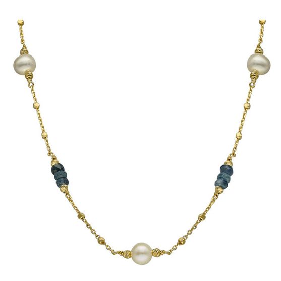 Au centre, une perle de culture lumineuse attire le regard par son éclat doux et satiné, symbole d'élégance intemporelle. De part et d'autre, de délicates perles et des éclats de saphirs aux nuances bleu profond viennent rythmer le collier avec fraicheur et sophistication.