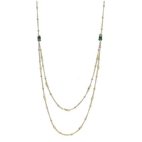 Composé de deux chaines au style fantaisie, ce bijou joue sur les superpositions pour créer un effet de volume délicat et moderne. Au point de jonction des deux chaines, un ornement d'émeraudes vient sublimer l'ensemble : leurs nuances vert profond apportent une note précieuse et lumineuse, tout en attirant subtilement le regard.