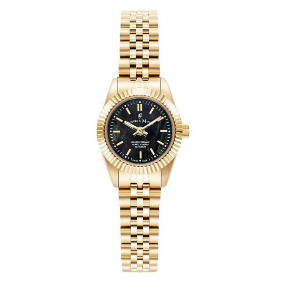 Cette montre Jacques du Manoir présente un cadran noir, une lunette dorée cannelée sur bracelet acier doré.