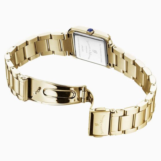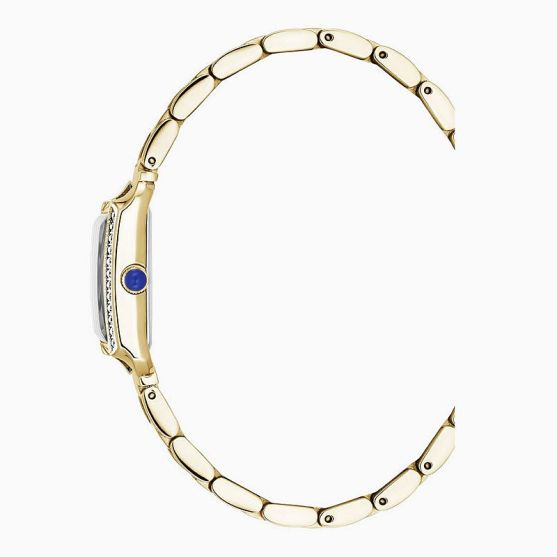Son boitier rectangulaire est sublimé de rangées de strass scintillants qui encadrent délicatement le cadran champagne. Les index ponctués de brillants et les aiguilles bleues apportent une touche de raffinement supplémentaire. Son bracelet à maillons dorés, à la fois robuste et sophistiqué, s'accorde parfaitement à l'ensemble0