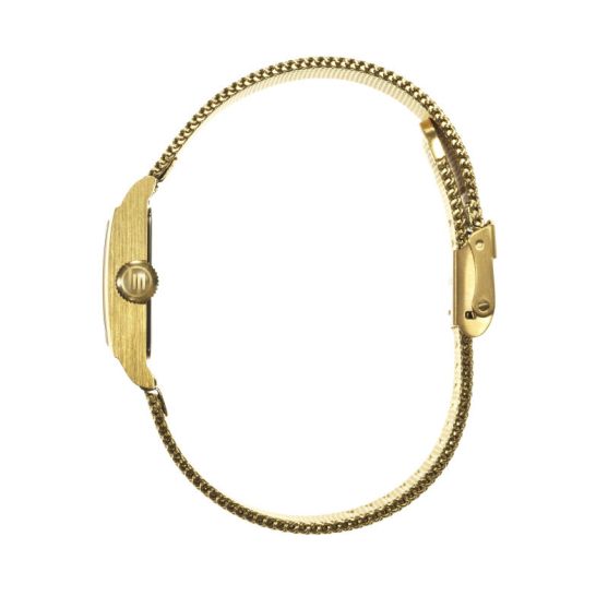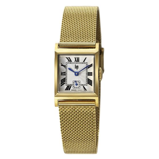 Montre femme Lip Churchill C18. Un boîtier carré en acier doré mesurant 21X21 mm sur un bracelet acier doré maille milanaise.